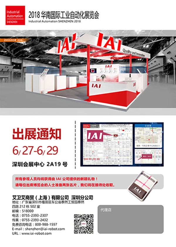 涵蓋了眾多業界自動化產品的2018華南國際工業自動化展覽會召開在即! IAI也將在本次博覽會上與各位分享最新研發的電缸系列產品。 親臨展臺即可獲得精美小禮品一份!