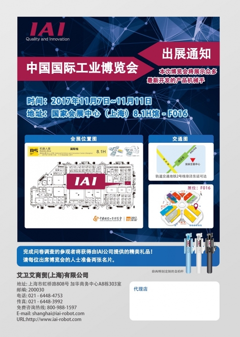 IAI將參加2017年中國國際工業博覽會。 參觀人員將有機會獲得由IAI公司特別提供的精美小禮品!歡迎屆時光臨! 時間:2017年11月7日-2017年11月11日 展位:上海國家會展中心 8.1H F016