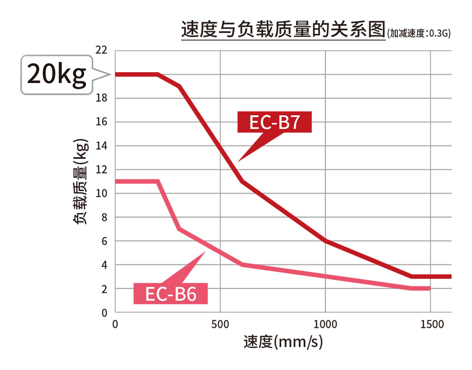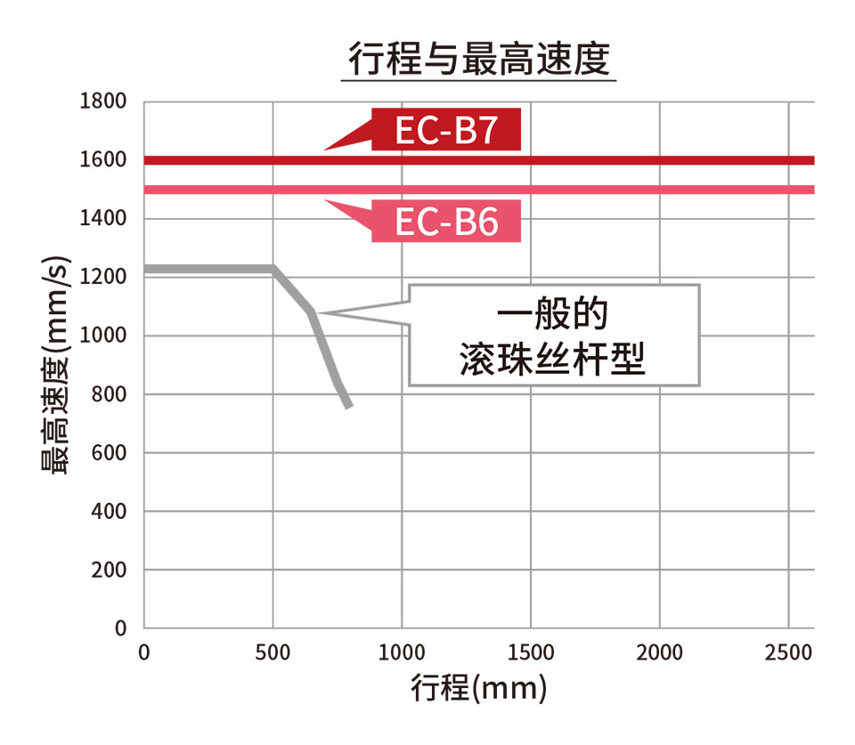 一般的滾珠絲桿型在行程增長(zhǎng)后,受滾珠絲桿危險(xiǎn)轉(zhuǎn)速的影響,最高速度會(huì)降低。EC-B6/7 采用皮帶驅(qū)動(dòng)方式,因此在長(zhǎng)行程時(shí)最高速度不會(huì)降低。